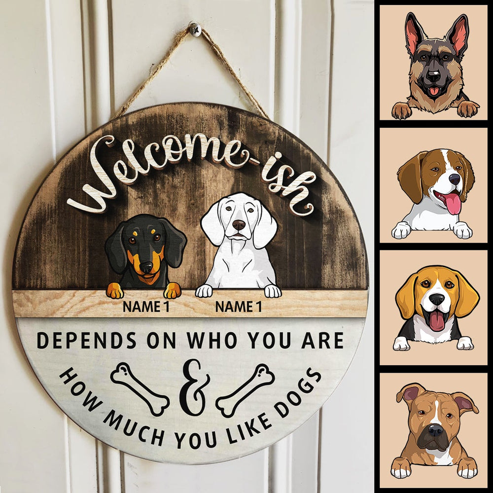 Welcome-ish Depends On Who You Are, Personalized Dog Breeds Rustic Door Sign, Front Door Decor