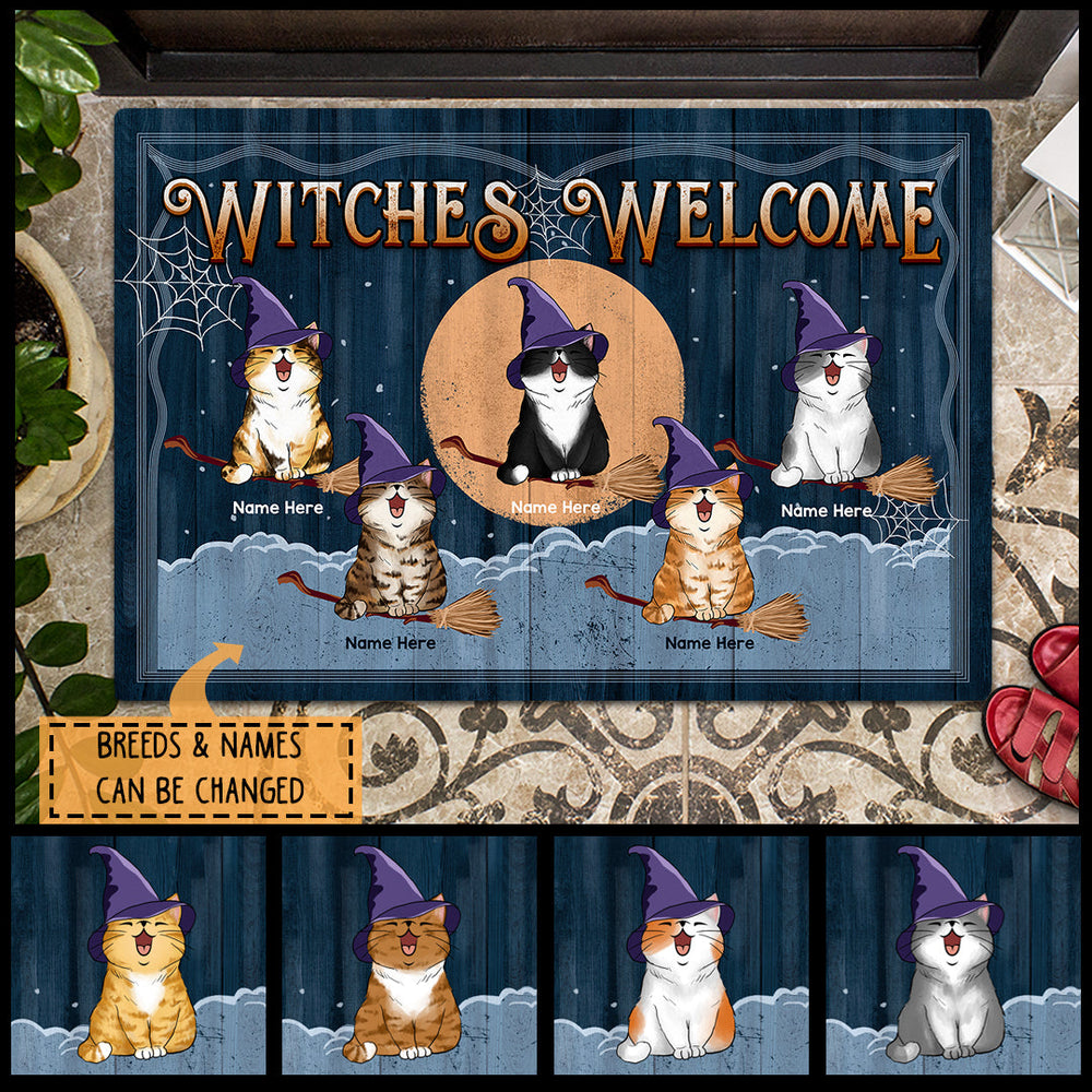 Witches Welcome - Witch Cats On Broom And Full Moon - Personalized Cat Halloween Doormat